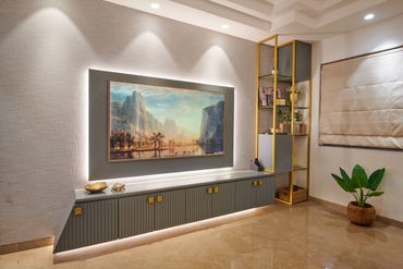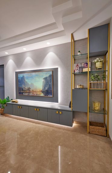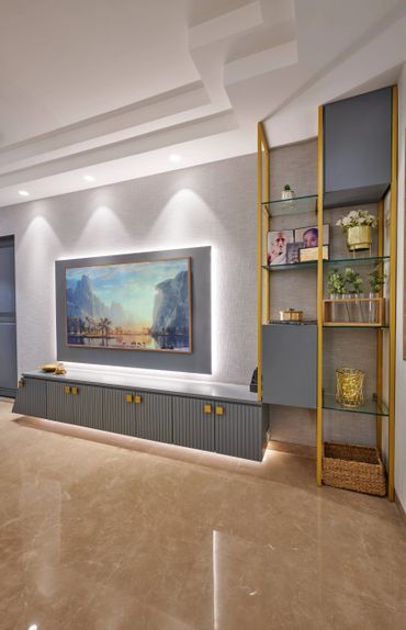 Designed with a neutral, sophisticated palette, this living room seamlessly integrates contemporary aesthetics with classic grandeur. The interplay of textures, high-end finishes, and ambient lighting creates a plush yet airy environment, making it a perfect setting for both entertaining guests and intimate family gatherings.